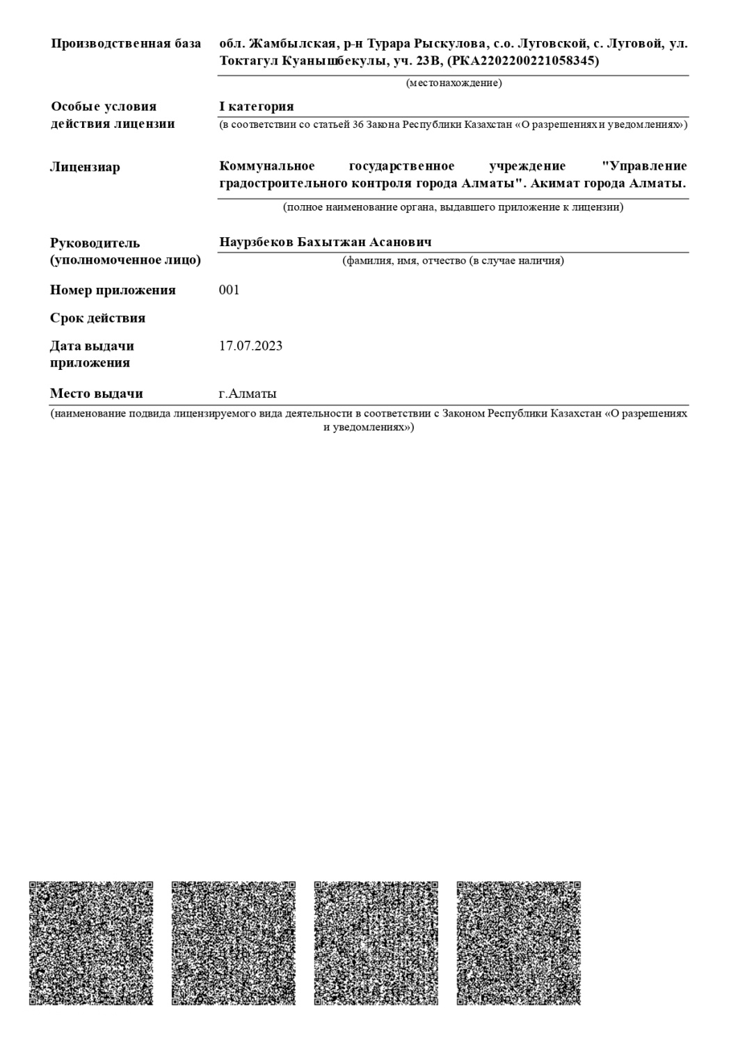 Лицензия выдана Управлением градостроительного контроля города Алматы.